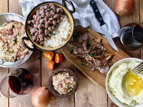 In this private virtual cooking class, we'll bring you to the family home, where you'll experience a traditional Brazilian meal enjoyed during a Churrasco. You'll start with Pão de Queijo, the famous Brazilian cheese bread found at nearly every local gathering. Naturally gluten free, this bread is just slightly crunchy, but more chewy and soft and just the slightest bit tart. A word of warning, you'll likely finish all of them before sitting down to enjoy your meal (so we hear from clients). Next, you'll move onto your gorgeous plate. Piled high with filet mignon served with sauteed onions, traditional rice and beans - and farofa. If you've never had farofa, get ready to enjoy meat in a whole new way. Served as an accompaniment to your meat, it's a nutritious toasted breadcrumby (but not at all) dip that adds a special crunch to your meal.